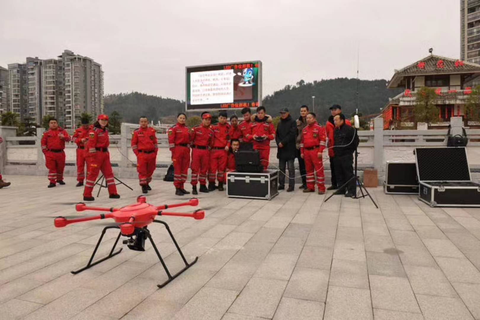 演練圓滿成功后貴州紅箭救援隊(duì)與智璟科技T60V2救援無人機(jī)合影