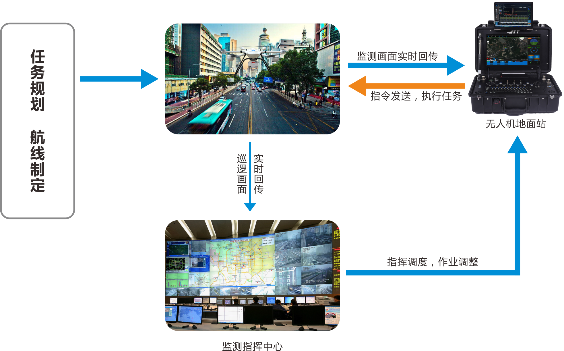 JTT無(wú)人機(jī)應(yīng)急指揮調(diào)度平臺(tái)可將無(wú)人機(jī)飛行平臺(tái)與城管部門(mén)系統(tǒng)無(wú)縫隙地連接成一個(gè)有機(jī)整體,解決無(wú)人機(jī)在城管執(zhí)法單位應(yīng)用中存在的技術(shù)難點(diǎn)及應(yīng)用盲區(qū)。JTT無(wú)人機(jī)應(yīng)急指揮調(diào)度平臺(tái)依托公網(wǎng)3G、4G以及專網(wǎng)4G LTE等多種無(wú)線網(wǎng)絡(luò)技術(shù)實(shí)現(xiàn)無(wú)人機(jī)空中實(shí)時(shí)視頻監(jiān)控并傳送相關(guān)畫(huà)面或視頻到移動(dòng)指揮平臺(tái),后臺(tái)系統(tǒng)根據(jù)相關(guān)視頻或畫(huà)面進(jìn)行智能識(shí)別和分析,匯總得出相關(guān)人員、車輛、現(xiàn)場(chǎng)與周邊情況為指揮人員或相關(guān)領(lǐng)導(dǎo)提供人力部署、應(yīng)急處理提供決策依據(jù)和技術(shù)保障。