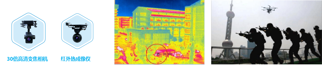 無(wú)人機(jī)可搭載30倍變焦相機(jī)飛抵現(xiàn)場(chǎng)偵察, 并將現(xiàn)場(chǎng)大致情況及時(shí)反饋給指揮中心;無(wú)人機(jī)可實(shí)施低空拍攝,將犯罪分子人數(shù)、規(guī)模、人員傷亡等情況及時(shí)傳回指揮中心,指揮中心根據(jù)無(wú)人機(jī)傳回來(lái)的消息,迅速做出決策,對(duì)武警特警、救護(hù)人員、消防人員等進(jìn)行合理部署;
