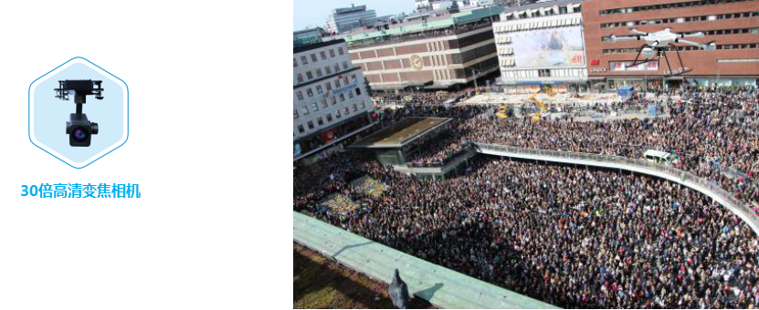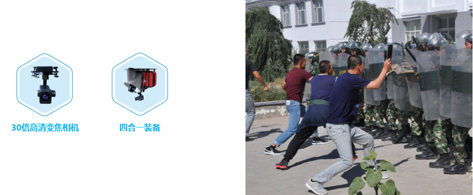 無(wú)人機(jī)可搭載30倍變焦相機(jī)飛抵事故目標(biāo)區(qū)域上空對(duì)目標(biāo)區(qū)域進(jìn)行全方位不間斷的監(jiān)控,全面掌控事態(tài)提供了先決條件??筛鶕?jù)無(wú)人機(jī)拍攝的資料對(duì)事故責(zé)任方進(jìn)行舉證, 同時(shí)可以了解目標(biāo)區(qū)域的事件發(fā)展情況, 及時(shí)形成相應(yīng)的決策, 防止事態(tài)失控。在事態(tài)失控時(shí),無(wú)人機(jī)可搭載四合一掛載攜帶急救包空頭醫(yī)療物品,對(duì)受傷人員進(jìn)行及時(shí)搶救,同時(shí)可以利用掛在上的喊話器對(duì)現(xiàn)場(chǎng)進(jìn)行喊話,疏散人群。