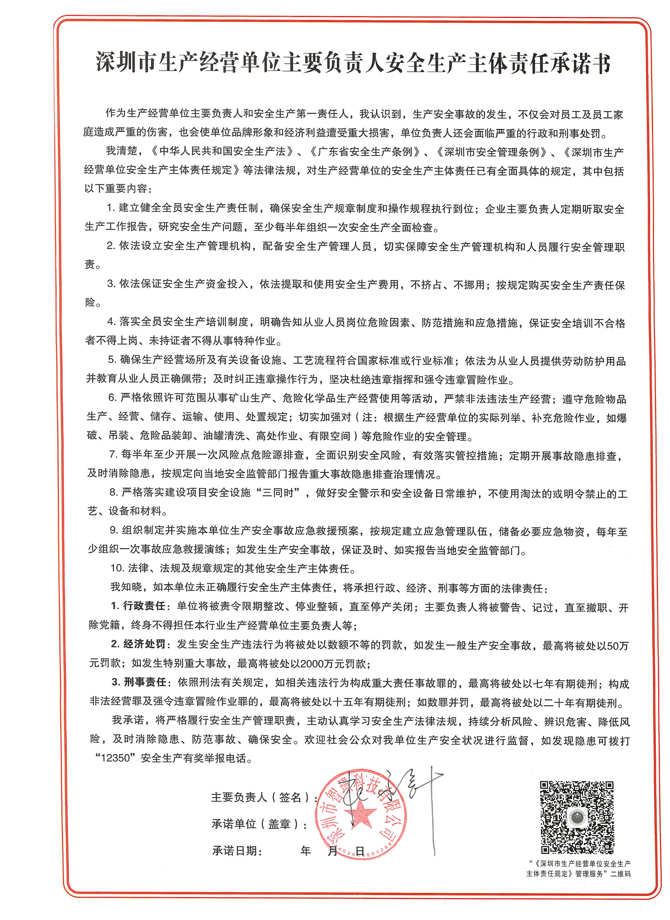 智璟科技簽署《深圳市生產(chǎn)經(jīng)營單位主要負責人安全生產(chǎn)主體責任承諾書》