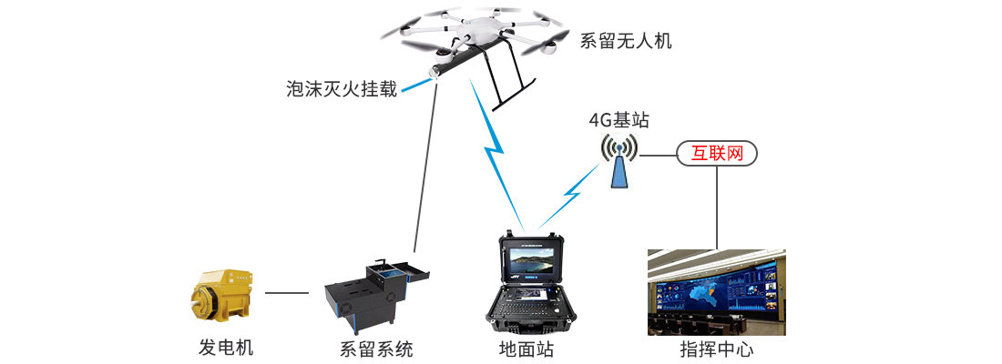 系留無人機系統(tǒng)由機載高壓電源、系留光電線纜和系留箱組成。飛行高度 60~100 米,可手動操作或遠程控制,無人機飛行平臺通過掛載不同任務載荷實現(xiàn)不同的應用場景,可隨人、車、船等一切可移動設備轉移地點目標,主要用于: