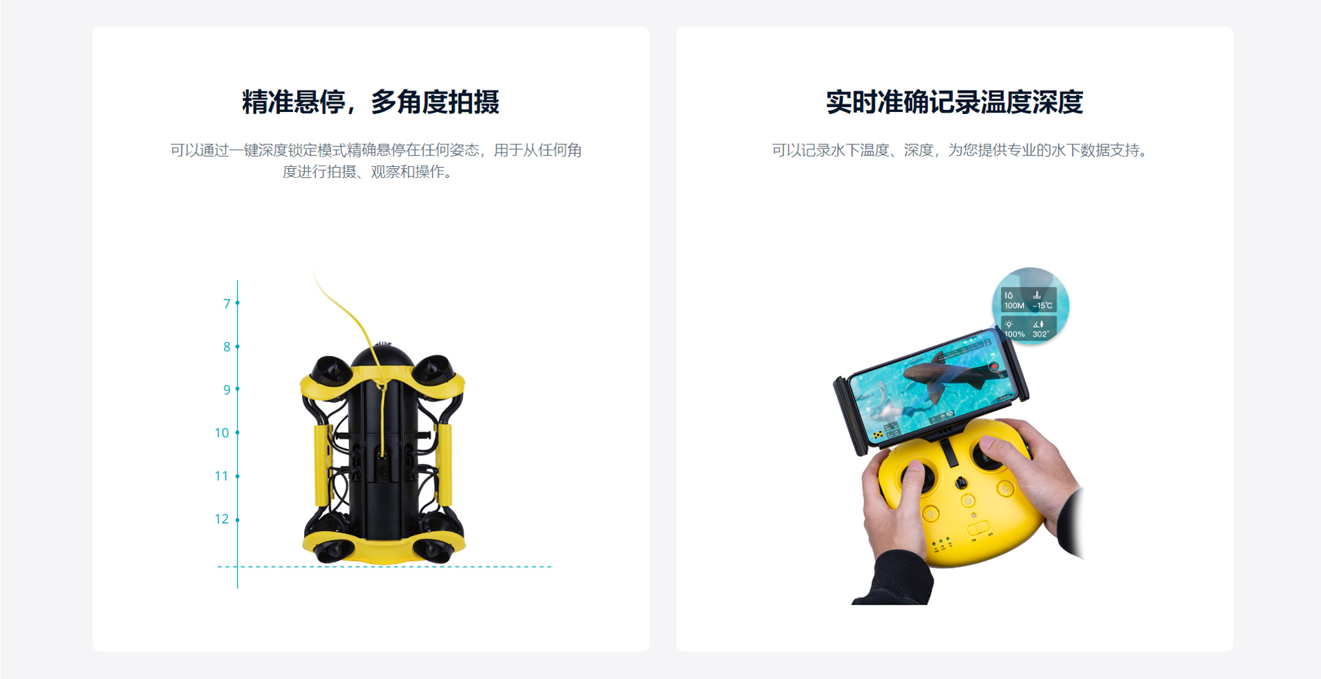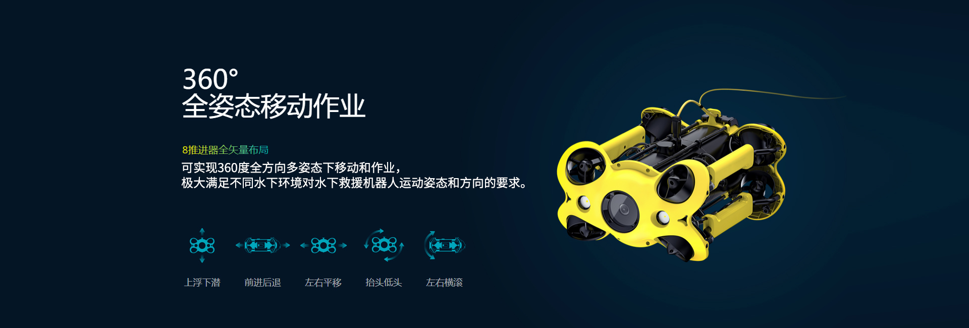 水下運(yùn)動姿態(tài):360度全方位全自由度運(yùn)動,全方向抗流穩(wěn)定,滿足12個(gè)自由度移動,包括:前進(jìn)/后退,左轉(zhuǎn)/右轉(zhuǎn),左平移/右平移,上浮/下潛,往下俯/往上仰,順時(shí)針翻滾/逆時(shí)針翻滾