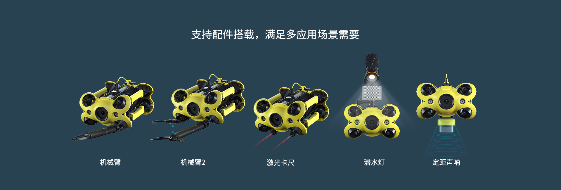 支持配件搭載,滿足多應(yīng)用場景需要:機(jī)械臂,激光卡尺,潛水燈,定距聲吶。