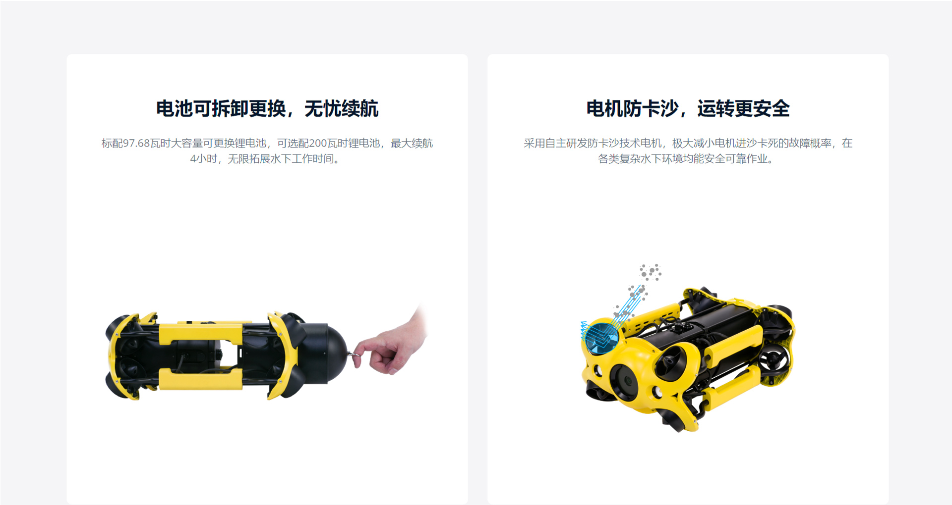 P1救援水下機(jī)器人是一款為專業(yè)用戶和政企用戶設(shè)計(jì)的輕工業(yè)級水下機(jī)器人。采用8推進(jìn)器全矢量布局,360度全方位移動。最大航速3節(jié)、深度100米、最大水平半徑200米。支持機(jī)械臂、GOPRO、外置LED燈和激光卡尺等多種掛載。內(nèi)置4K/1200萬像素EIS防抖相機(jī)、4000流明LED燈、可拆卸/可更換電池,可插拔SD存儲卡、鋁合金緊湊型機(jī)身(重量小于5KG)、選配電動繞線器,單人操作可3分鐘快速部署。